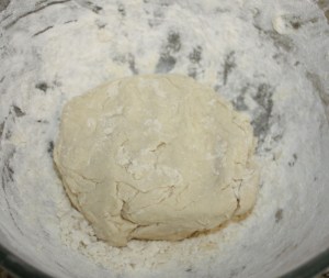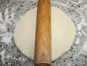 En el banco de la cocina poner un poco de harina. Extender la masa con un grosor de 2 – 2,5 cm, utilizando un rodillo o una botella.