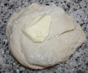 Amasar en el banco de la cocina unos 4 minutos. Añadir la mantequilla.