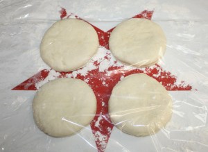 Colocamos los círculos en una bandeja enharinada, tapamos con film y dejamos que reposen para que doblen su tamaño.