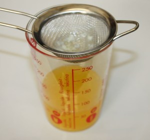 Veremos como la grasa se separa del suero que formará una capa blanquecina en el fondo. En la superficie va a aparecer una espuma que podemos eliminar con un colador, con cuidado de que no caiga el suero del fondo.