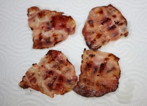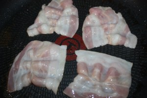 Dorar las lonchas de beicon, partidas por la mitad, en la misma sartén donde hemos hecho las tostadas. Siempre que hagáis beicon o panceta no añadir nada de aceite ya que por si mismo ya suelta mucha grasa.