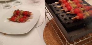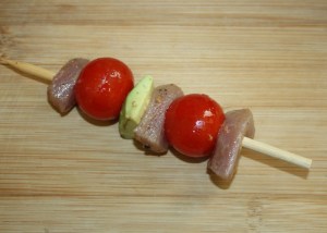 Montar las brochetas: pavo, cherry, pavo, aguacate, pavo, cherry y pavo.