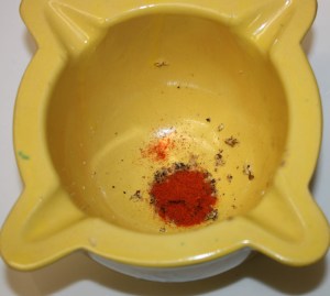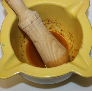 Lo más importante de esta receta es el adobo: machacar en un mortero los granos de pimienta y cilantro. Añadir el ajo pelado y la sal.