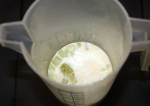 Poner en el vaso de una batidora y añadir la leche evaporada y el yogur.