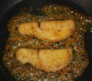 En la misma sartén que hemos utilizado para hacer la manzana caramelizar el foie. Vuelta y….
