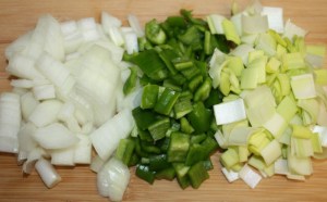 Cortar la cebolla, puerro y pimiento en trozos grandes, no hace falta que sean muy pequeños ya que después los vamos a triturar.