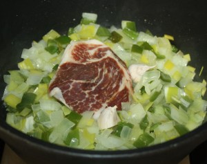 En una sartén con las 10 cucharadas de aceite poner las verduras ( cebolla, puerro y pimiento ). Salpimentar. 10 minutos a fuego medio. Mover de vez en cuando para que no se doren demasiado.