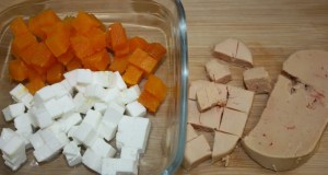 Cortar la calabaza asada, el queso y el foie en daditos.