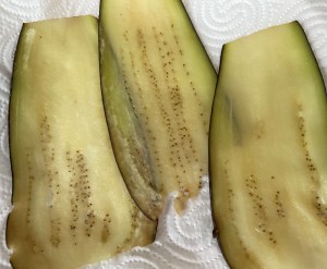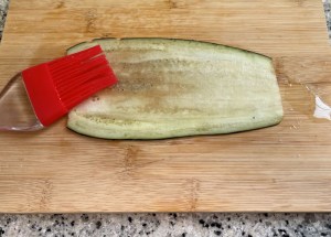 Quitar los extremos de la berenjena, partir por la mitad a lo largo.