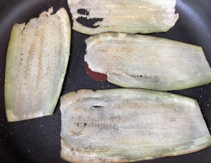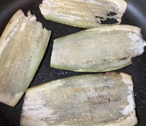 Calentar una sartén y dorar las berenjenas por los dos lados. No hace falta poner aceite ya que lo llevan untado las láminas de berenjena.