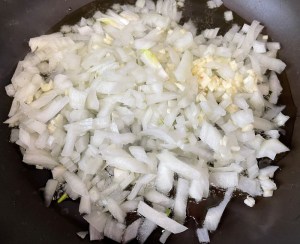Calentar una sartén con el resto del aceite. Añadir el ajo y la cebolla con una pizca de sal. 5 minutos a fuego medio.