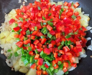 Cortar la patata en pequeños dados y añadir a la sartén. Salpimentar. Otros 5 minutos. Siempre es importante remover bien para que no se nos pegue.