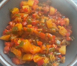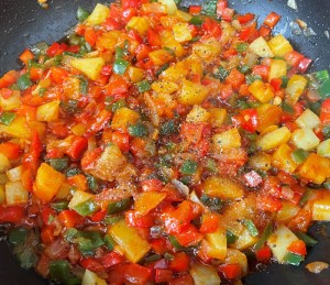 Cortar los pimientos en daditos, eliminando previamente las semillas y partes blancas.