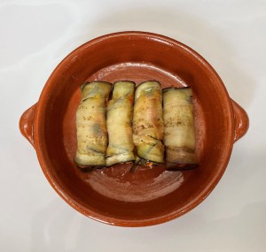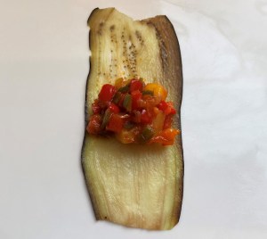 En el centro de cada cortada de berenjena poner un poco de verduras. Enrollar.