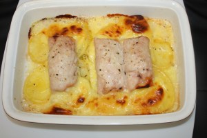 Untar una fuente de horno con un poco de aceite. Cubrir el fondo con rodajas de patata. Salpimentar y regar con el vino blanco y un poquito de aceite.