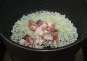 Picar la cebolla. En una olla con las 6 cucharadas de aceite y una pizca de sal pochar 3 minutos a fuego medio – bajo.