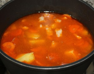 Pelar y cortar en dados la patata, y el chorizo en rodajas. Incorporar a la olla con el resto de ingredientes. 2 minutos.