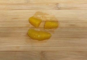 Cortar las naranjas al vivo y cada gajo por la mitad.