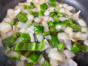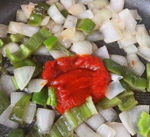 En una sartén con el aceite pochar la cebolla y el pimiento cortado en trozos. No hace falta que sean muy pequeños ya que después lo vamos a triturar. Fuego bajo.
