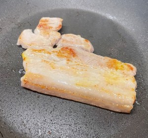 Quitar la piel de la panceta. Dorar en una sartén sin nada de aceite.
