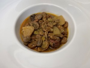Poner a cocer las habas en una cazuela de barro con agua que las cubra, y una pizca de sal. En cuanto el agua comience a hervir bajar el fuego al mínimo y tapar.