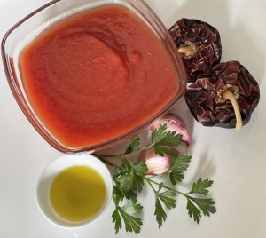 - SALMORRETA: 2 ñoras, 2 ajos, 2 cucharadas de AOVE, 2 ramas de perejil, 200 g tomate natural triturado ( 12 cucharadas ) y una pizca de sal