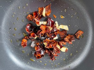 En una sartén con las 2 cucharadas de AOVE poner los trozos de ñora y los ajos. Sofreír 7 minutos a fuego bajo.
