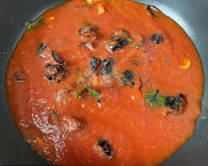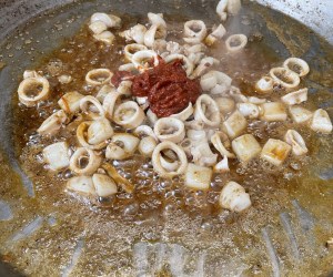 En cuanto comiencen a saltar poner 4 cucharadas de salmorreta. Mover todo junto 2 minutos.
