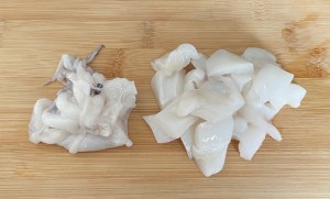 Quitar la cabeza y tentáculos de las sepias y cortar el cuerpo en pequeños dados.