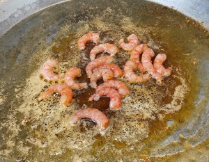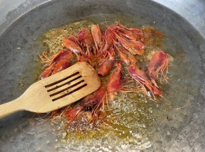Poner los cuerpos de las gambas. Una vuelta y en cuanto cambien de color sacar y reservar.