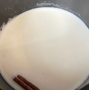 Poner la leche en un cazo con la canela o vainilla. Llevar a ebullición y retirar del fuego. Colar cuando esté tibia.
