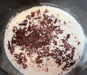 Añadir a la leche y volver a poner al fuego hasta que se funda el chocolate. Entibiar.