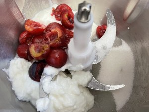 Deshuesar las cerezas y triturarlas con el azúcar y yogur.