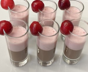 Colocar en la mitad de una copa de cristal transparente la crema de chocolate. Meter en la nevera media hora. Colocar encima la crema de cerezas y decorar con una cereza deshuesada colocada en el borde de la copa.