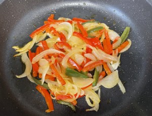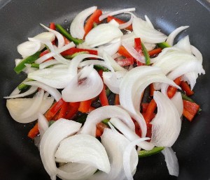 Cortar la cebolla en juliana y el pimiento y el jalapeño en tiras. Sino tenéis jalapeño lo podéis sustituir por pimiento verde y un poco de picante.