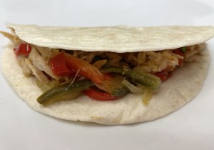 Servir todo por separado para que cada comensal se monte su propio taco: tortillas, pollo, verduras, cilantro y lima.