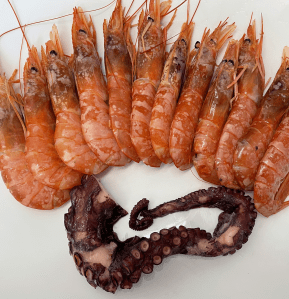 Añadir los cuerpos de las gambas, el pulpo y apagar el fuego para dejar que repose y se termine de hacer el arroz.