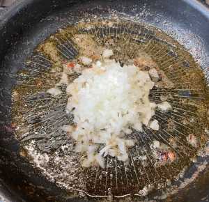 Vamos ahora con el sofrito. Añadir a la sartén la cebolla picada y una pizca de sal. 5 minutos a fuego bajo.
