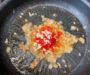 Poner el ajo también picado, el pimiento y otra pizca de sal.