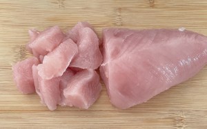 Colocar en un plato las patatas, encima los dados de pechuga y sobre ellos las hojas de perejil frito. Acompañar con la salsa de curry y un poco de ensalada verde.