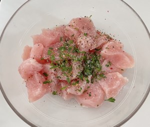 Macerar con zumo de medio limón, sal, pimienta y perejil picado. Tapar con film y dejar en la nevera un mínimo de 1 hora. Si lo dejáis toda la noche mejor.
