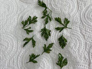 En una sartén con un poco de aceite hacer unos crujientes de perejil. Cuando el aceite esté bien caliente poner las hojas. En cuanto deje de saltar el agua que contienen sacar ya que se queman con mucha facilidad.
