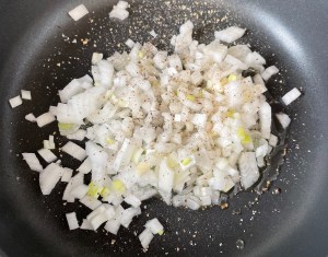 En una sartén con 3 cucharadas de aceite pochar la cebolla. Salpimentar. 5 minutos a fuego bajo desde que el aceite comience a chisporrotear. Debe quedar transparente, no dorada.