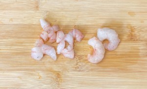 Descongelar las gambas. Lo mejor es pasarlas el día anterior a cocinarlas del congelador a la nevera. Trocear.