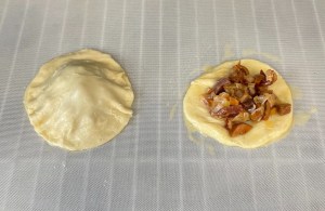 En una fuente de horno colocar un silpat o papel de horno y encima el círculo de pasta más pequeño. Poner una capa del relleno dejando el borde libre. Colocar encima el otro círculo que hemos cortado con el aro más grande. Presionar los bordes para cerrarlo. Pintar con huevo y meter en el horno precalentado a 210º hasta que se dore.