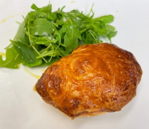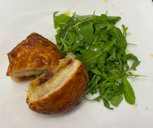 Sacar del horno, dejar que se enfríe un poco y servir acompañado de rúcula aderezada con escamas de sal y AOVE.