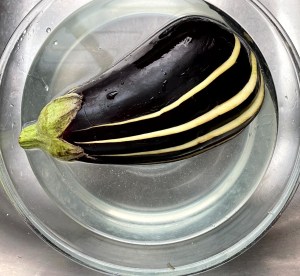 Cortar las berenjenas en forma de abanico en láminas de 1 cm de grosor sin llegar a que se desprendan del tallo.