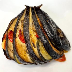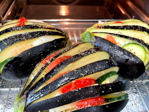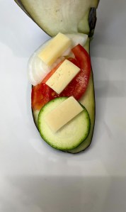 Entre las láminas de berenjena intercalar rodajas de tomate, cebolla, calabacín y encima de cada verdura un trocito de queso.