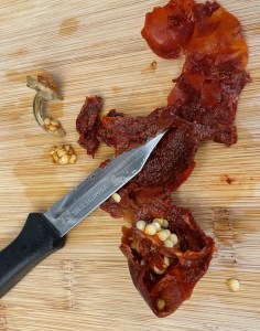 Abrir la ñora, quitar las semillas y rascar la carne.