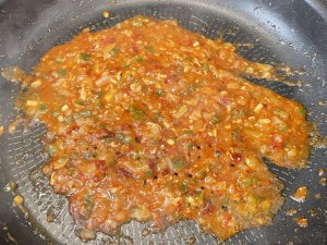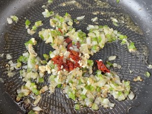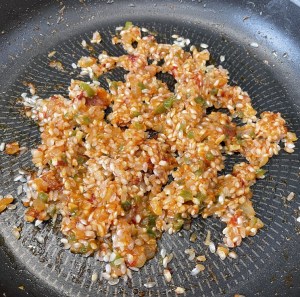 Añadir el ajo y la carne de la ñora. 2 minutos. No dejar de mover para que no se queme.